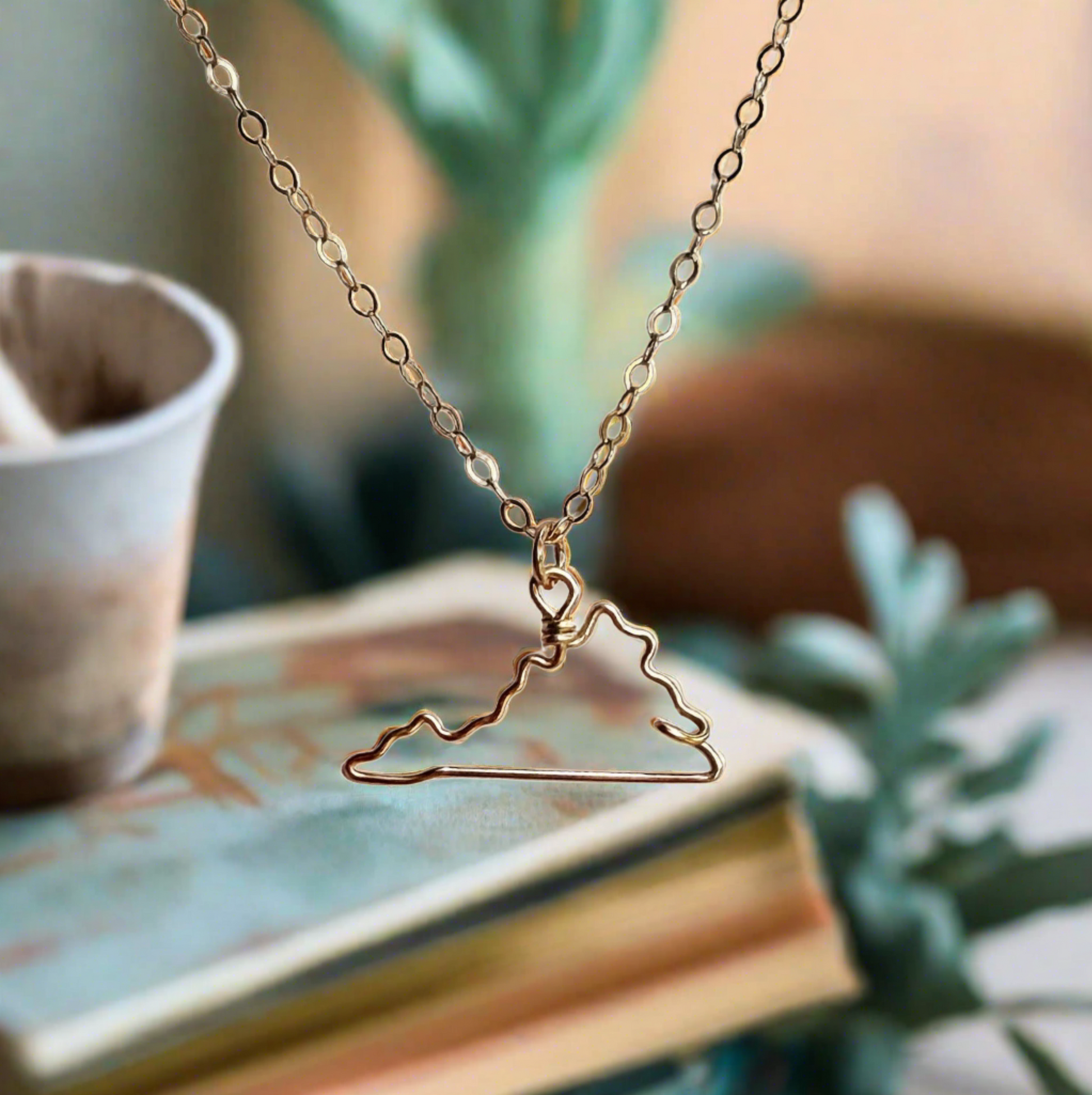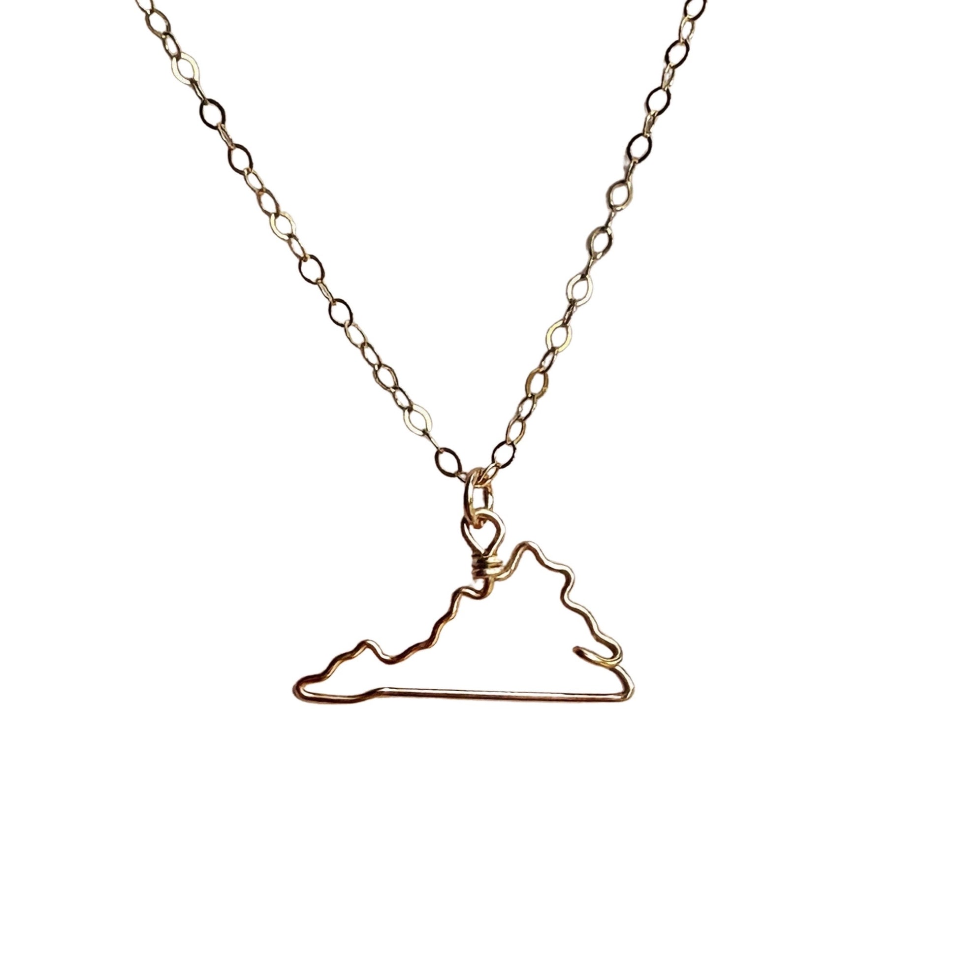 Snapshot: From the hallowed grounds of Jamestown to the majestic peaks of the Blue Ridge Mountains, Virginia's rich tapestry of history and natural beauty is unparalleled. This Virginia outline necklace, crafted by hand from a single piece of wire, captures the essence of the Commonwealth, honoring its role as the cradle of America and the diverse landscapes that define it.